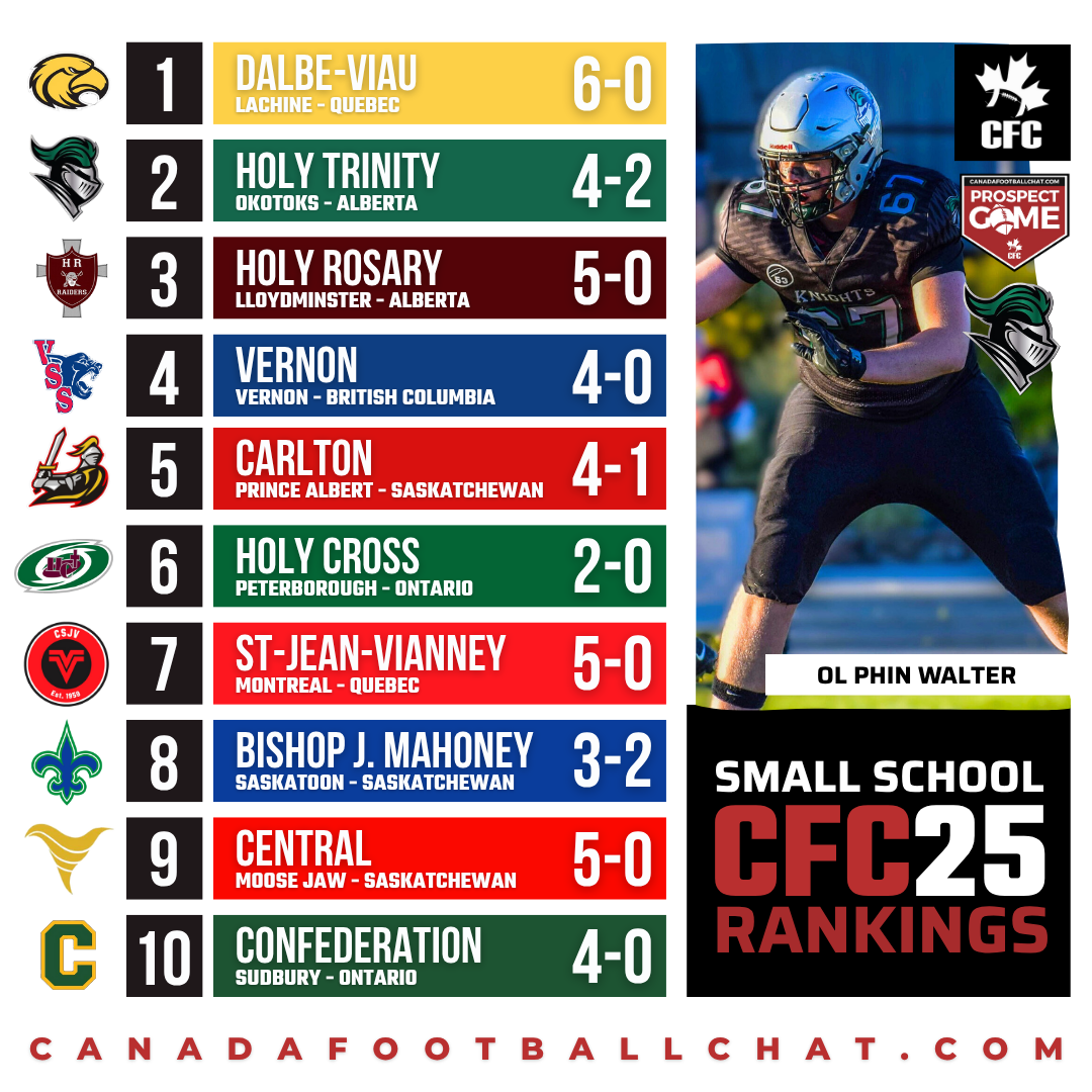 - There’s been some question marks circling Holy Trinity Academy this year in their bid for back-to-back Tier II provincial titles, but they were able to silence the doubters this week with a huge 19-15 victory over CFC50 31st ranked Salisbury. Heading into this contest, Salisbury were riding high with their only loss of the season coming to CFC50 1st ranked Harry Ainlay, where they put up an incredible fight losing 20-10. Now you can’t follow the bouncing ball too far and say that Holy Trinity Academy could beat Harry Ainlay, but the context matters when you’re looking at the rankings. It’s gotta be an incredible confidence boost for this edition of the Knights, who fell just shy of beating back-to-back CFC50 ranked squads with a tight 21-16 loss to 30th ranked Lethbridge CI, who then went on to breeze past Catholic Central in a 54-0 blowout this week. All this madness has caused a huge reshuffle in the rankings with the Alberta programs, but all this movement is just white noise until we get to watch the best in Tier II duke it out for the provincial title in November.