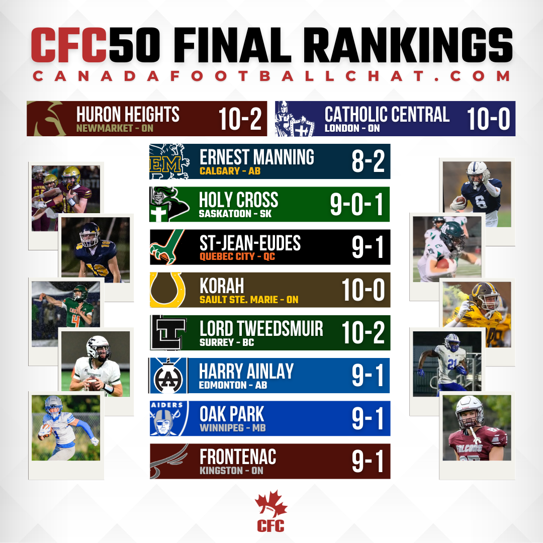 - Controversial? Maybe to some. Cop out? Potentially. We’ll let you be the judge, because for only the second time in history, we have declared Huron Heights and Catholic Central as CFC50 National Co-Champions. We know that Huron Heights will always believe they were the better team, and of course Catholic Central will go to their graves thinking the same thing. We could have easily picked one over the other and called it day, but the reality is that there’s nothing we can use to confidently decipher who deserves it more between these two juggernaut programs. Unfortunately the nature of high school football in a behemoth province like Ontario means that OFSAA cannot schedule a proper playoff system that would declare one universal champion, and even if they did, the controversial debates would still persist when it comes to deciding which schools get left on the sidelines because there’ll never be room for everyone. We know the conversation comes up every year, and we’re sure that OFSAA has spent plenty of time trying to devise a plan that’s fair and equitable, but until that day comes we’ll always be left with the burning question about who is truly the best team after the OFSAA Football Festival. The way it stands now, Ontario will remain the ultimate outlier when coming up with the rankings because there’s never a promise that the top teams will meet on the field, and now this season will become an outlier as well when people look at the history of the CFC50 High School Rankings. Congratulations to both programs for putting together fantastic campaigns, and here’s to hoping that OFSAA schedules another YRAA vs. WOSSAA showdown at the Festival next season.