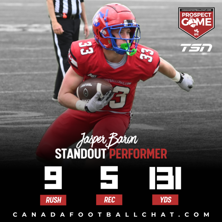 In a game packed with highlight reel moments, Class 2026 RB Jasper Baron out of Centennial in Coquitlam, BC delivered one of the most electrifying performances of the day at the fifth annual CFC Prospect Game at Hamilton Stadium.