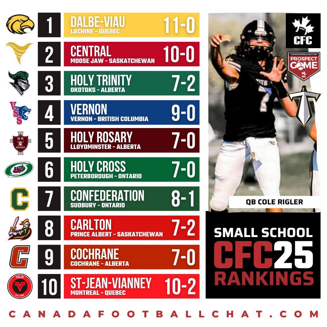 | 3 | 3 | Holy Trinity Academy Knights | Okotoks | AB | 0-0 | 7-2 | 0-0 | W 49-28 vs. Bishop Carroll |
