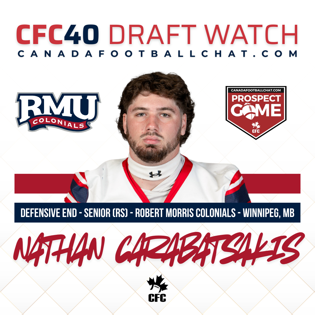 Welcome back to CFC40 Draft Watch, where we highlight Canadian talent eligible for the upcoming CFL and NFL Drafts. Today we spotlight 2019 CFC Prospect Game participant DE Nathan Carabatsakis out of Robert Morris.