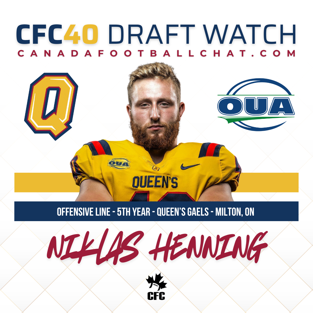 Welcome back to CFC40 Draft Watch, where we look at upcoming draft-eligible Canadian football players across the U Sports and NCAA landscapes. Todayβs player of focus is Queenβs OL Niklas Henning out of Milton, ON.