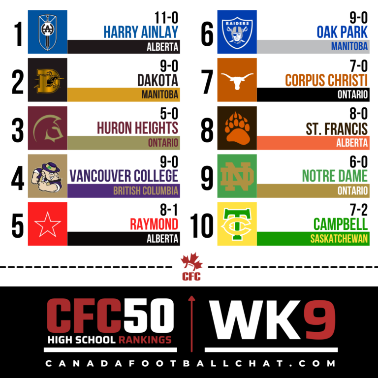 | 47 | UR | St. Paul’s Crusaders | Winnipeg | MB | 6-3 | 0-0 | L 24-10 vs. Oak Park |