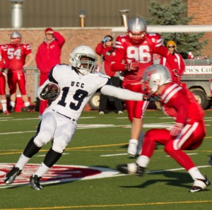 Like the Saints, UCCβs defense played exceptionally as well. They were able to sac Saints quarterback Chris Merchant a few times, and forced him to throw away the ball on several occasions. The normally passing quarterback was forced to run into dangerous situations and risk losing the ball with to the terrorizing UCC defense. No. 84 Marc-Andre Alexandre played safety along with receiver duties, and kept St. Andrewβs receivers from making many big catches.