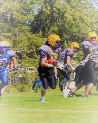 JV Linebacker Clayton Mrazek carries the ball on a Stallions trick play (credit: The Mrazek Family)