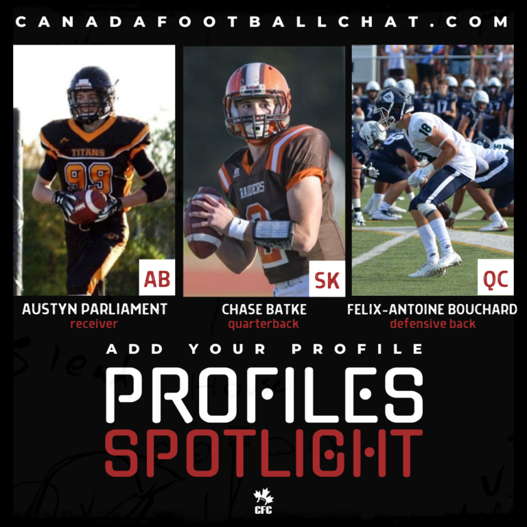 Today we highlight WR Austyn Parliament,DB Felix-Antoine Bouchard and QB Chase BatkeΒ in the Profile Spotlight. Make sure to build your Personal CFC Profile and get it added to the database so we can include your profile in future articles!