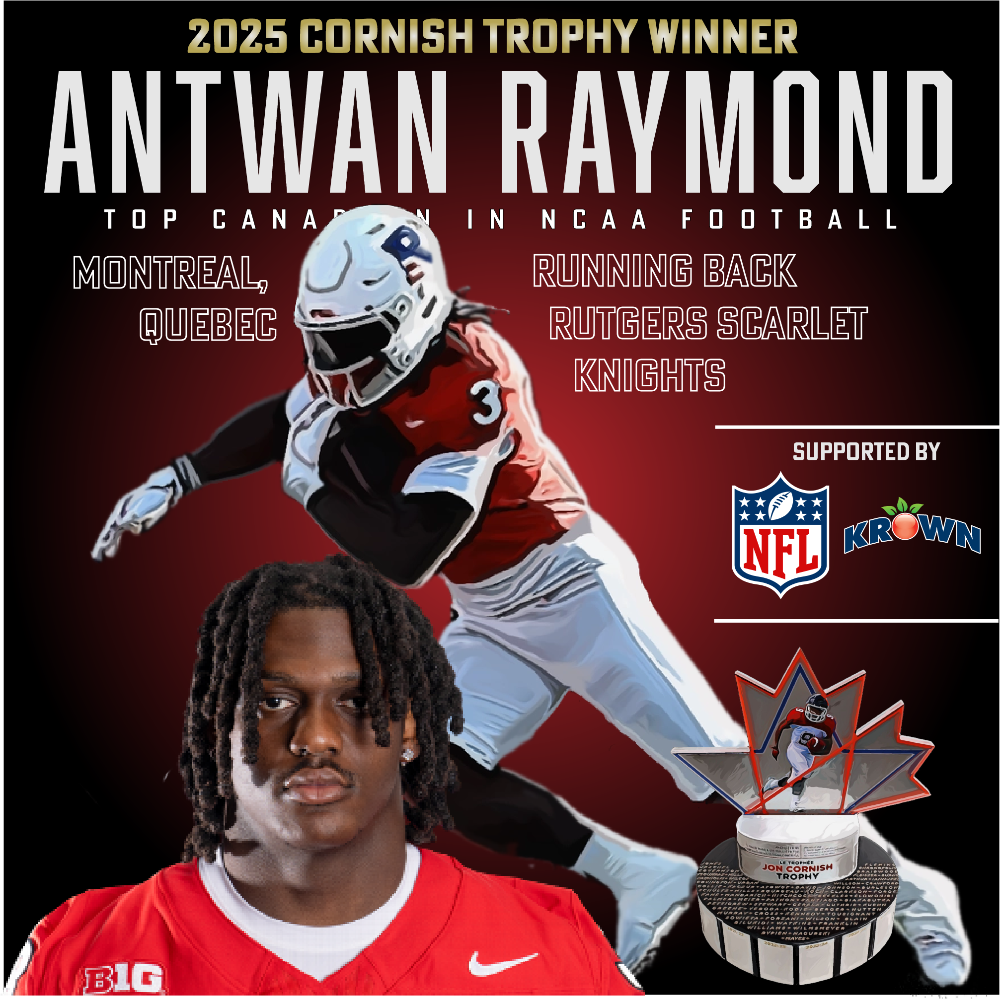 VANCOUVER, BC/PISCATAWAY, N.J.β Rutgers Scarlet Knights running back Antwan Raymond (MontrΓ©al, Que.) has been named the 2025 Jon Cornish Trophy recipient, awarded annually to the top Canadian player in NCAA football.