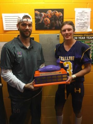 Jordan Travis and Defensive Coordinator Ed Shrubsole with the Cottage Cup Trophy; Travis set a Varsity team record with four interceptions. (Photo by Jason Romisher)