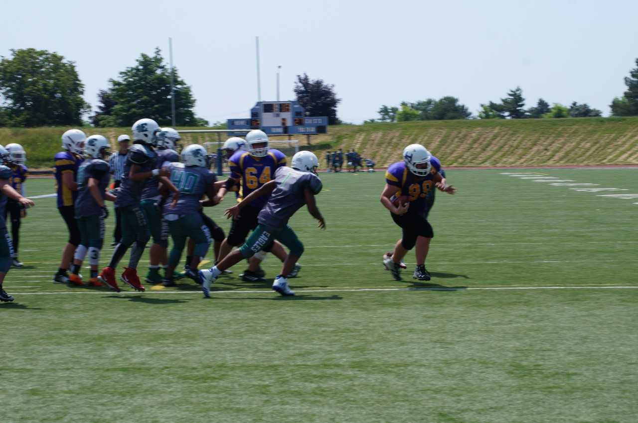 The Huronia Stallions Junior Varsity team finished the regular season with a 4-4 record after a 27-12 upset victory over the Etobicoke Eagles. The Eagles came into the game with a 6-1 record that included a 30-9 victory over Huronia earlier in the season. The Stallions offence set the tone by taking on early 7-0 lead on a 15-yard touchdown catch by standout receiver Payton Plesh. The Stallions clung to a 13-12 lead in the fourth quarter when Scott Laybolt stopped an Etobicoke drive deep into Stallions territory with his third interception of the game. On the ensuing drive, Huronia running back Marcus Tenney ran over several Eagle defenders on a spectacular 45-yard reverse field touchdown scamper. Plesh delivered another blow by drilling the kickoff past the Etobicoke returner who subsequently fumbled the ball at the two-yard line. Tenney then punched in another touchdown to put the game out of reach. Plesh had another spectacular game with over 100-yards receiving and two field goals. The rookie receiver continues to improve each week and has cemented his status as one of the top offensive players in the league and a threat to score on any possession. The defense was led by Scott Layboltβs excellent play, the relentless hustle of Kyle Nesbit, a quarterback sack by Cole Rines, and outstanding pass coverage by Daniel Forbes who had four pass break ups.